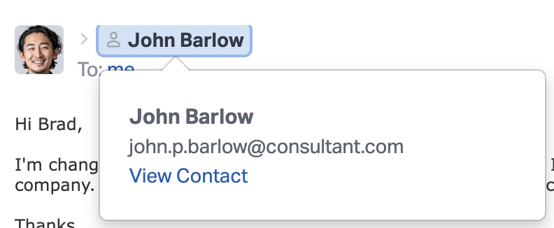 A: To navigate to a particular contact’s record page, click on the contact's name within an email and click “Go to contact”: