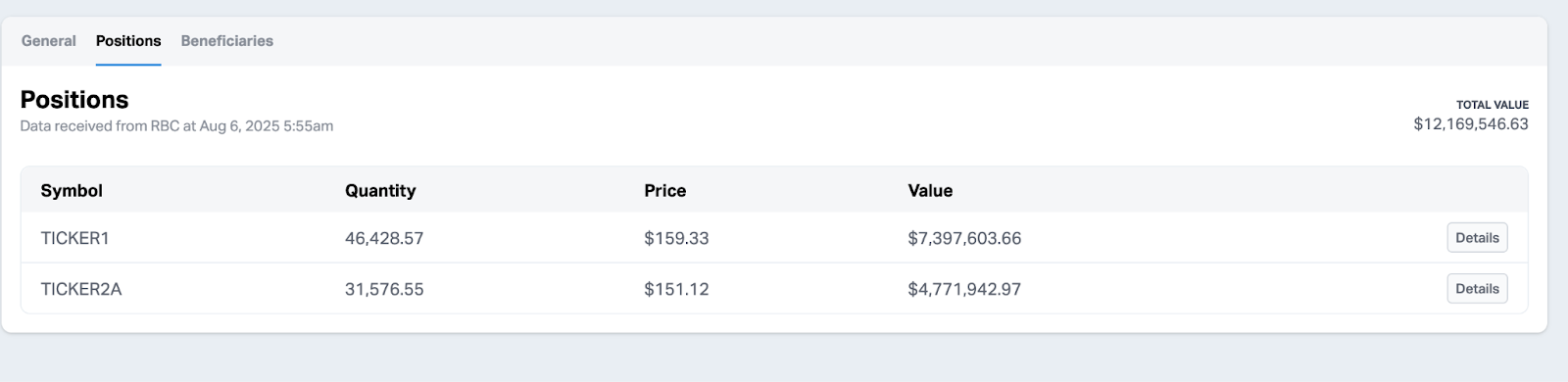 - Positions: Securities with symbols, quantities, prices, values