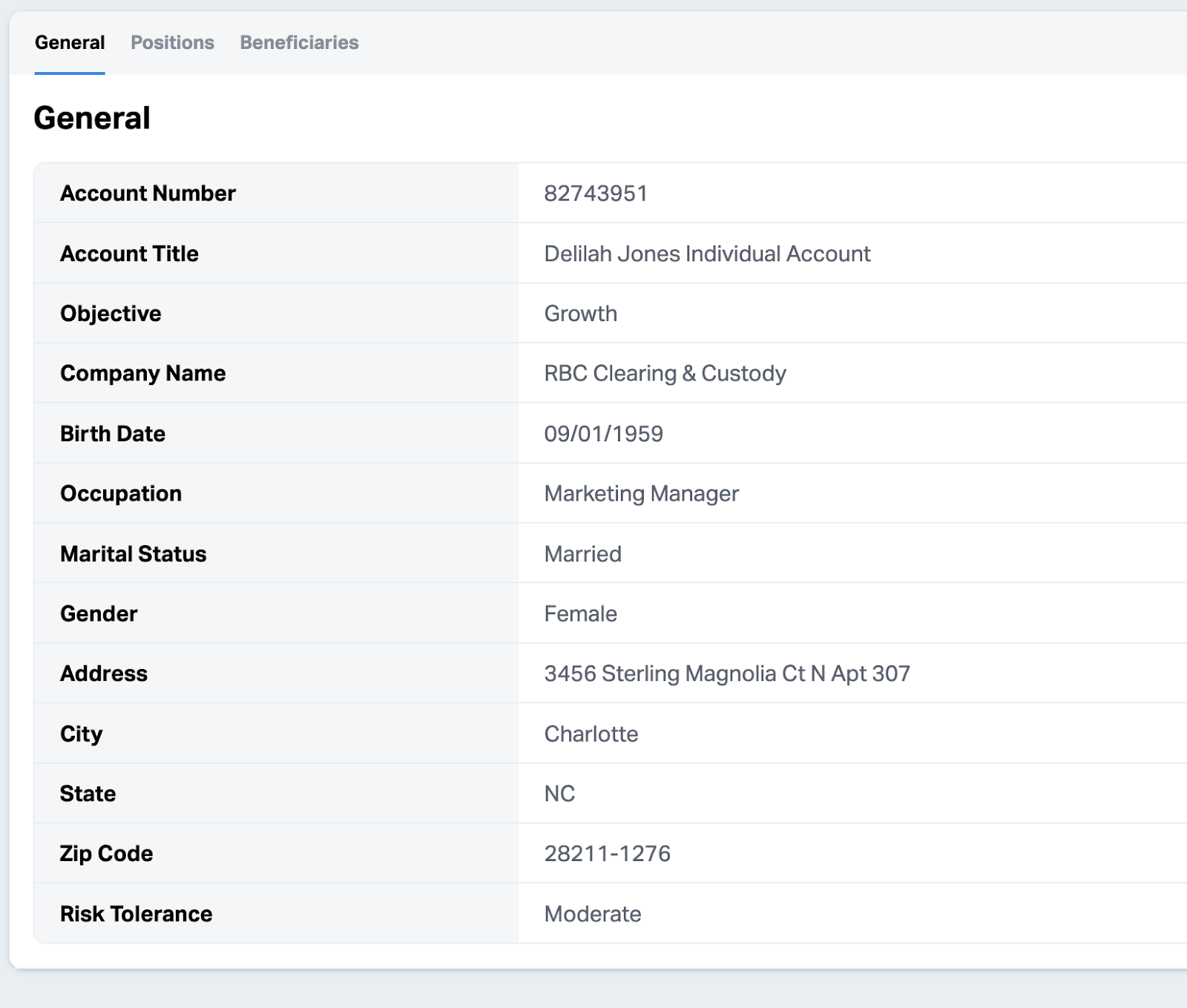 - General Info: Demographics, address, risk tolerance, investment objective