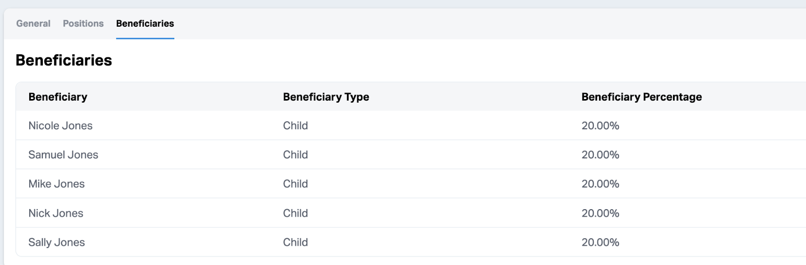 - Beneficiaries: Names, types, percentages