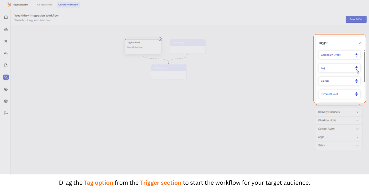 Step 2: Select Your Trigger — Click on the Trigger section in the workflow canvas and select Tag from the available options. Choose the tag that identifies your Kapitalwise prospects (for example: "Kapitalwise Leads"). Tags should be assigned to your prospect audiences when you first bring them into Kapitalwise.