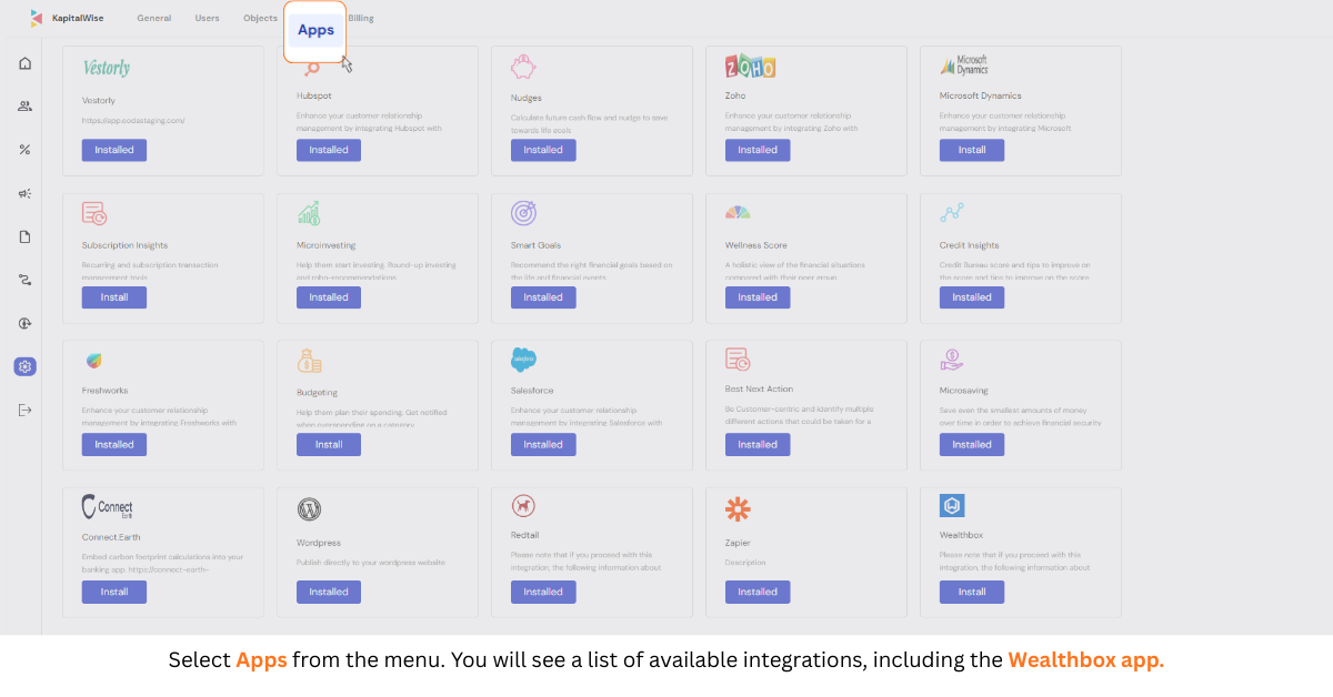Step 1: Access the Apps Section — Log in to your Kapitalwise account and navigate to Settings, then select Apps from the menu. You will see a list of available integrations, including the Wealthbox app with the Wealthbox logo.