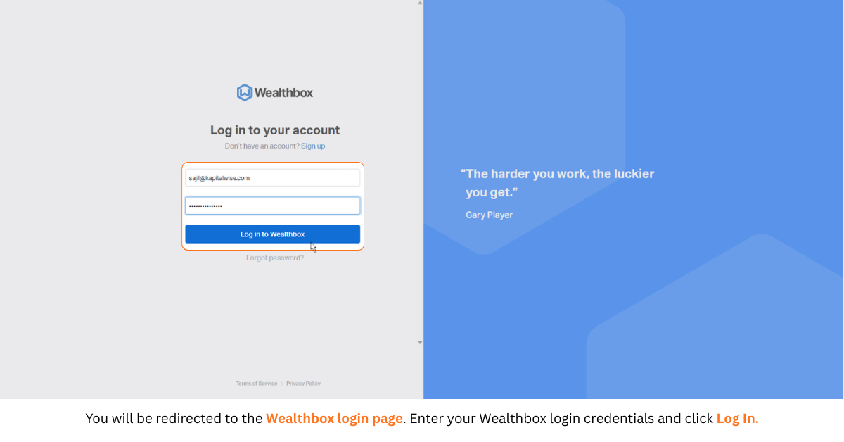 Step 4: Authenticate Your Wealthbox Account — You will be redirected to the Wealthbox login page. Enter your Wealthbox login credentials (User ID and Password) and click Log In to authenticate and establish the secure connection.