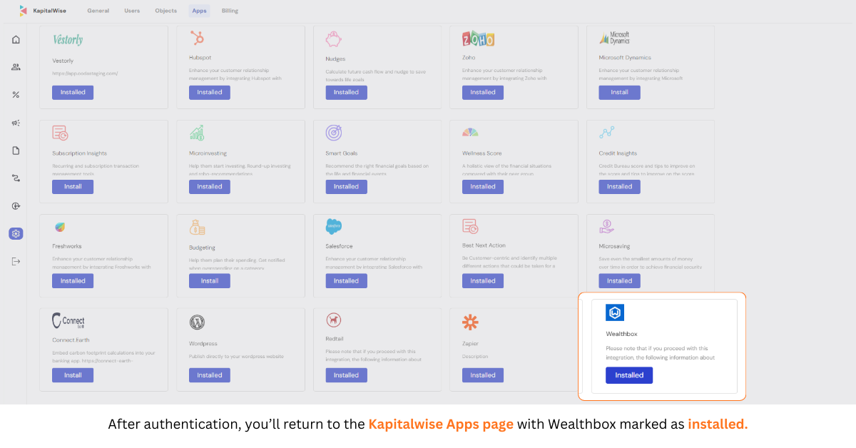 Step 5: Confirm Installation — Upon successful authentication, you will be redirected back to the Kapitalwise Apps page. The Wealthbox app will now display as Installed, confirming the integration is active, and you can begin setting up automated workflows to move leads between platforms.