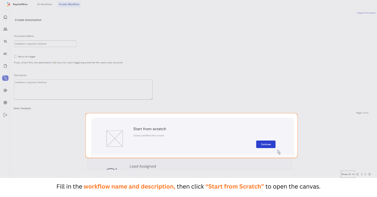 Step 1: Access the Workflow — From your Kapitalwise dashboard, click the Workflow icon in the left navigation panel. Click "Create Workflow" then "Start from Scratch" to open the workflow canvas.